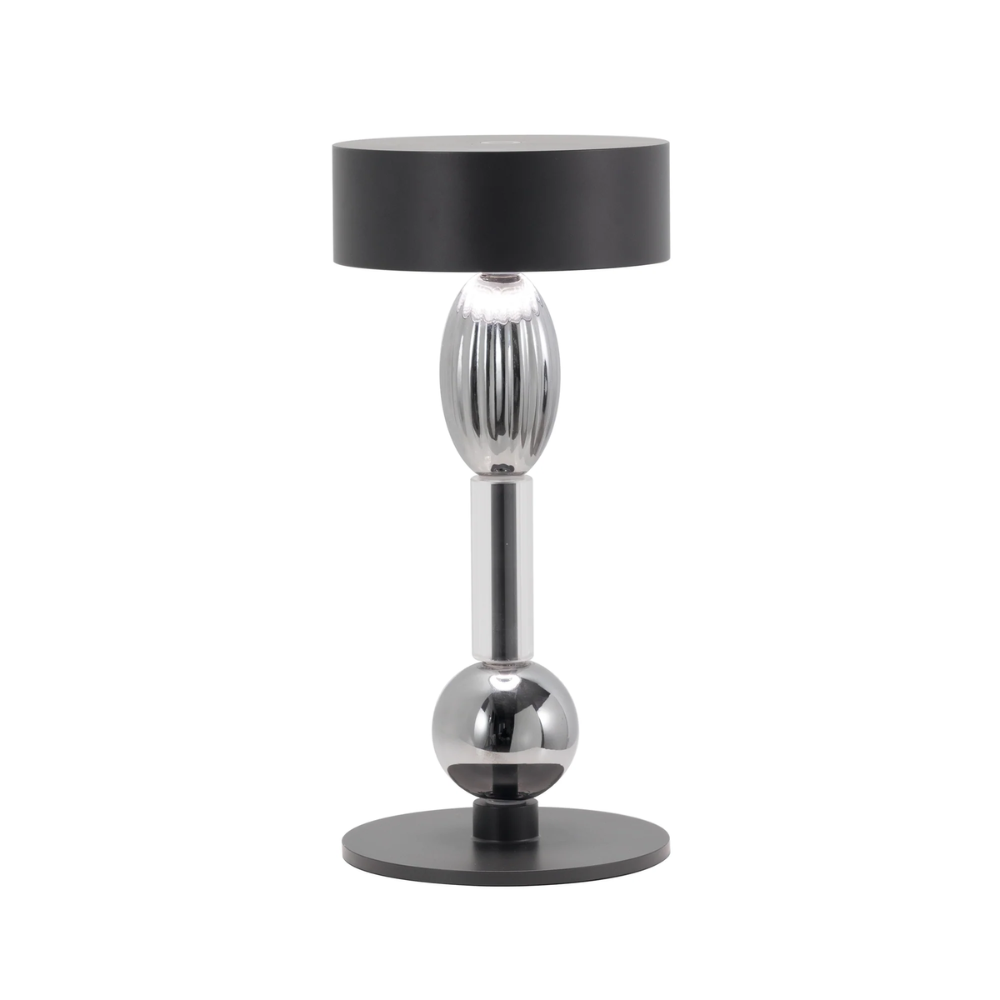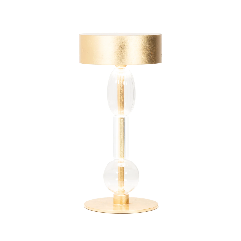 Designed by Lucchesedesign, the Royal Family Wi-Fi cordless, rechargeable battery lamp blends refined aesthetics and innovative technology in a luminous decorative object. This LED table lamp features touch control and 2.4 GHz Wi-Fi connectivity for remote control via app, with optional offline use in standard mode. The painted aluminum structure is enhanced with hand-blown borosilicate glass elements and a prismatic polycarbonate diffuser, creating refined and atmospheric lighting effects. The dimmable LED system allows you to choose between four color temperature settings (2200K, 2700K, 3000K, 4000K) and adjust the light intensity. Equipped with a contact charging base (included), the Royal Family Wi-Fi lamp runs on a rechargeable and replaceable lithium battery, offering up to 36 hours of autonomy depending on usage, and fully recharges in approximately 5 hours. The USB charger is sold separately. With an IP65 protection rating, this lamp is also suitable for outdoor use (except for the gold leaf version, for which continuous outdoor use is not recommended). Available in matte white, titanium, and gold leaf finishes, it's the perfect choice for those seeking a sophisticated, connected style—ideal for residential or contract settings.