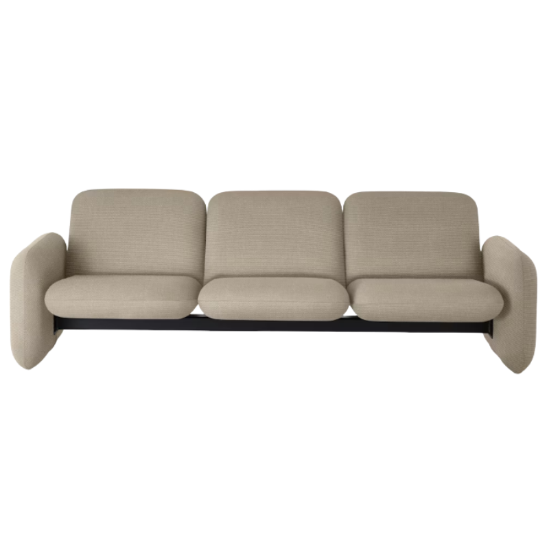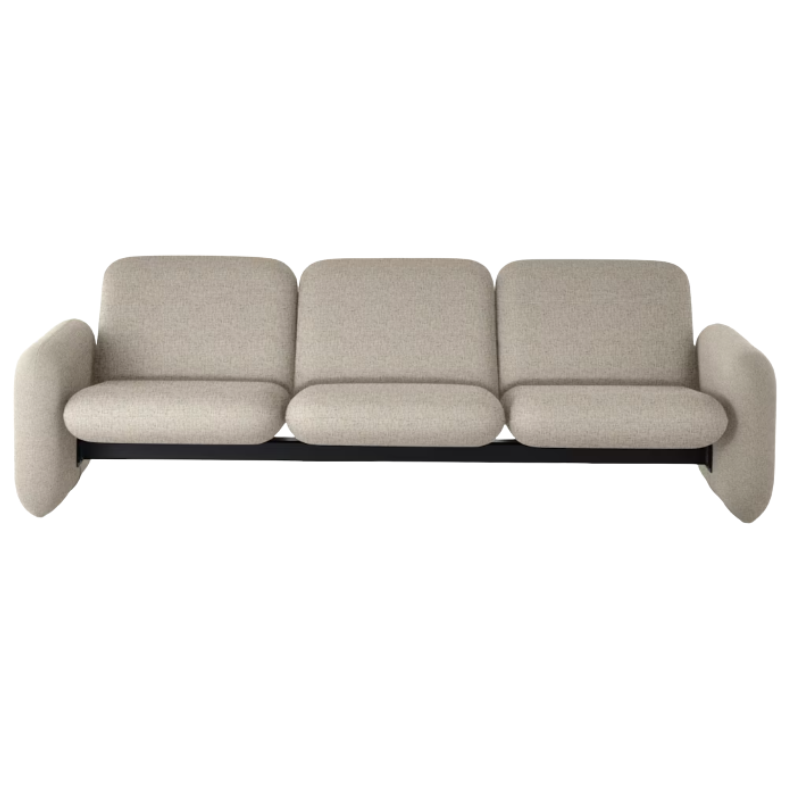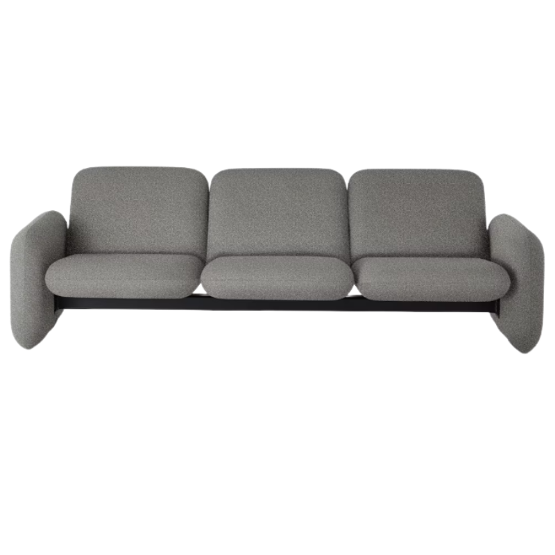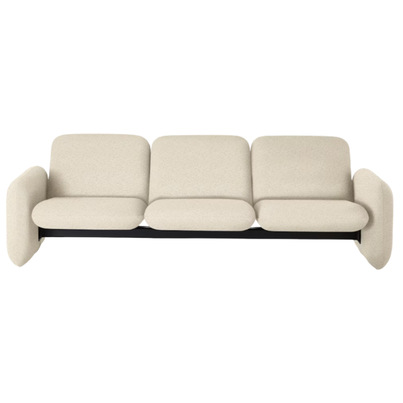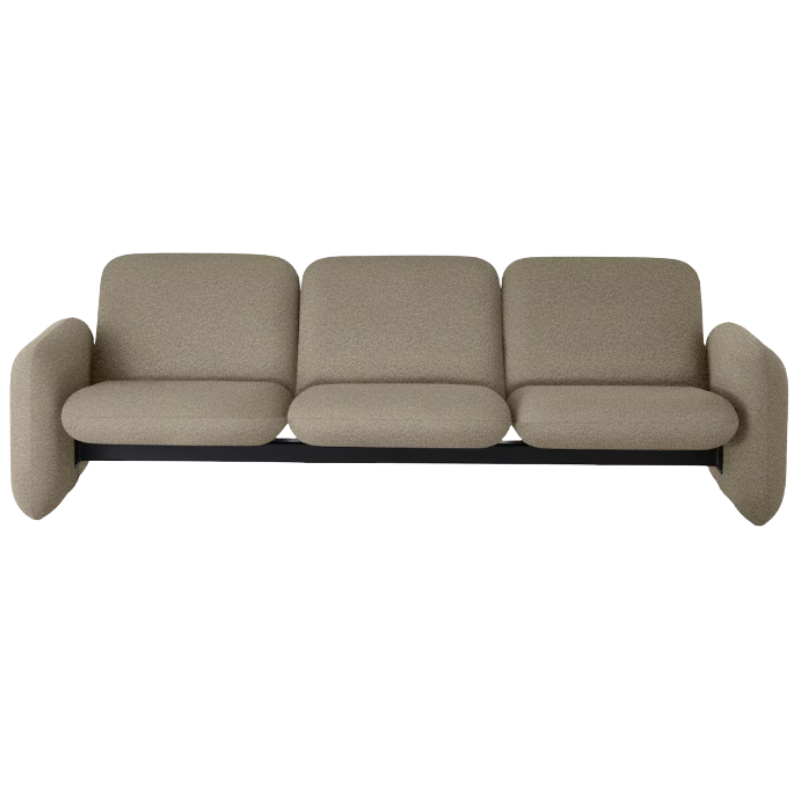 Materials: The piece is constructed with a steel support beam and brackets, an internal plywood frame, injection-molded foam, and is available in several upholstery options including Maharam Beck fabric (78% wool, 22% nylon), Flamiber Boucle fabric (33% acrylic, 30% wool, 29% cotton, 7% polyester, 1% viscose), Maharam Nico fabric (63% wool, 21% polyester, 16% nylon), and Contour fabric (100% polyester)
