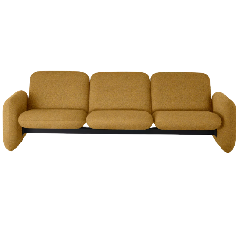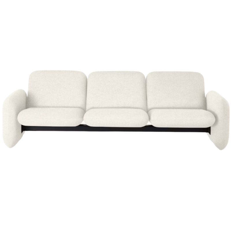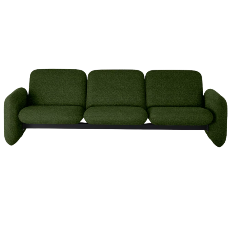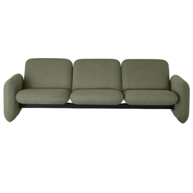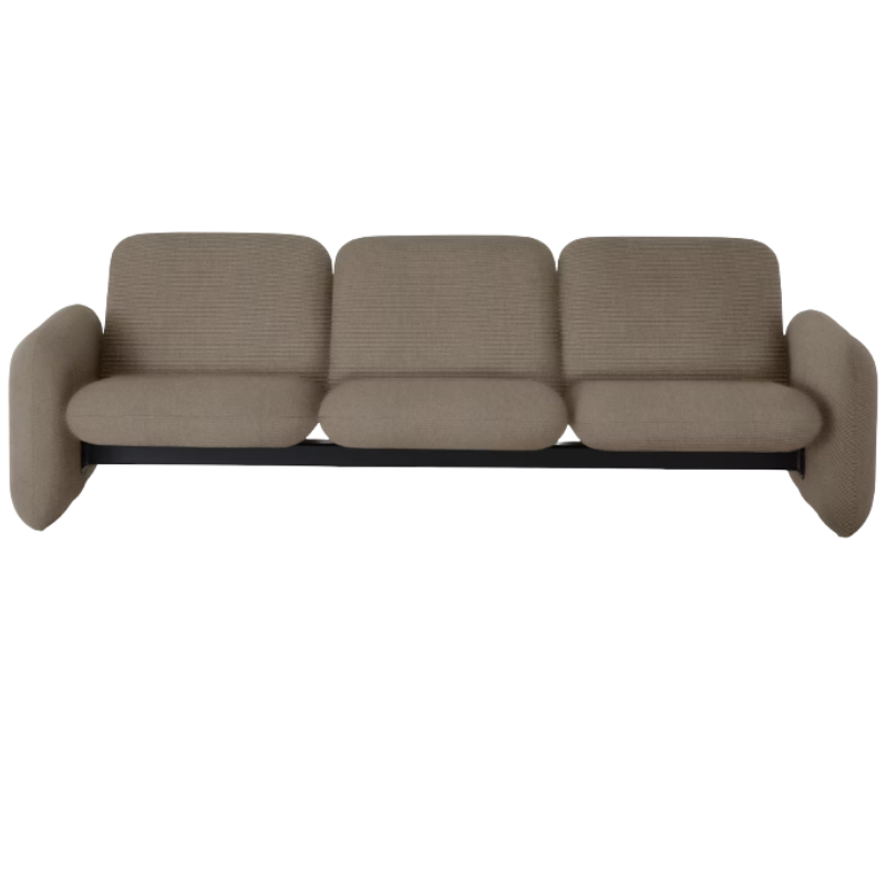 Materials: The piece is constructed with a steel support beam and brackets, an internal plywood frame, injection-molded foam, and is available in several upholstery options including Maharam Beck fabric (78% wool, 22% nylon), Flamiber Boucle fabric (33% acrylic, 30% wool, 29% cotton, 7% polyester, 1% viscose), Maharam Nico fabric (63% wool, 21% polyester, 16% nylon), and Contour fabric (100% polyester)