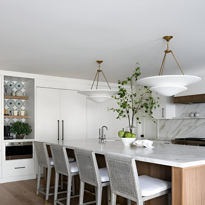 The Mollino by AERIN offers a contemporary take on old-world elegance. Suspended from a jewelry-like chain, the lightweight shallow bowl shapes in a plaster finish recall 1930s French sculpture yet deliver modern sophistication. The emanating warm glow will add subtle luxury to entryways, dining rooms, or hallways.
