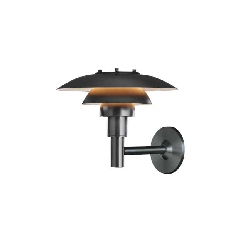 Poul Henningsen designed the three-shade system in 1925–1926. The first lights using the system were designed for an exhibition in Paris. His work with Louis Poulsen continued until his death in 1967. Throughout his life, PH sought to create glare-free lighting, aiming to direct light where it was most needed and creating soft shadows while using incandescent bulbs as a light source. The PH 3/2½ Wall is a member of the three-shade family and is one of 19 versions available today. Approximately one thousand different models have been produced over the years and consist of table, floor, and wall lamps, as well as a number of different chandeliers, which were very popular in the 30s for lighting private homes with high ceilings. There were countless combination options. The lights were available in different colors as well as a range of sizes. The first shades were made of metal with a painted undersurface, such as white, gold, or silver, depending on whether diffuse, warm, or cold light was desired. Glass was later introduced for the three-shade system. In addition to the downward-directed light, glass lamps illuminated the room. PH was the first person to pursue a scientific approach to light and use the logarithmic spiral as a basis. By using a design based on the logarithmic spiral, he achieved an even distribution of light over the entire curve of the shade. This even light distribution, together with the diffuse reflection through the glass, made it possible to control glare and shadow. Each shade reduces the amount of light equally, due to their distance from the light source. The PH light model numbers refer to the shade size. Each top shade had a corresponding set of middle and lower shades. In the pure models, such as the 2/2, the top shade has a size of about 20 cm, with corresponding lower shades. PH 3/2½ Wall consists of an approximately 30 cm top shade but uses lower shades from the 2½ model. These hybrid models were introduced due to the desire to hang pendants at lower heights. The system was also used for wall, floor, and table lamps. PH 3/2½ Wall was introduced in 2005.