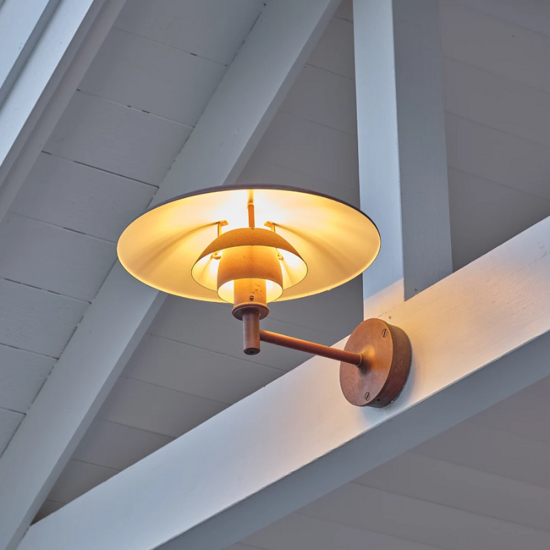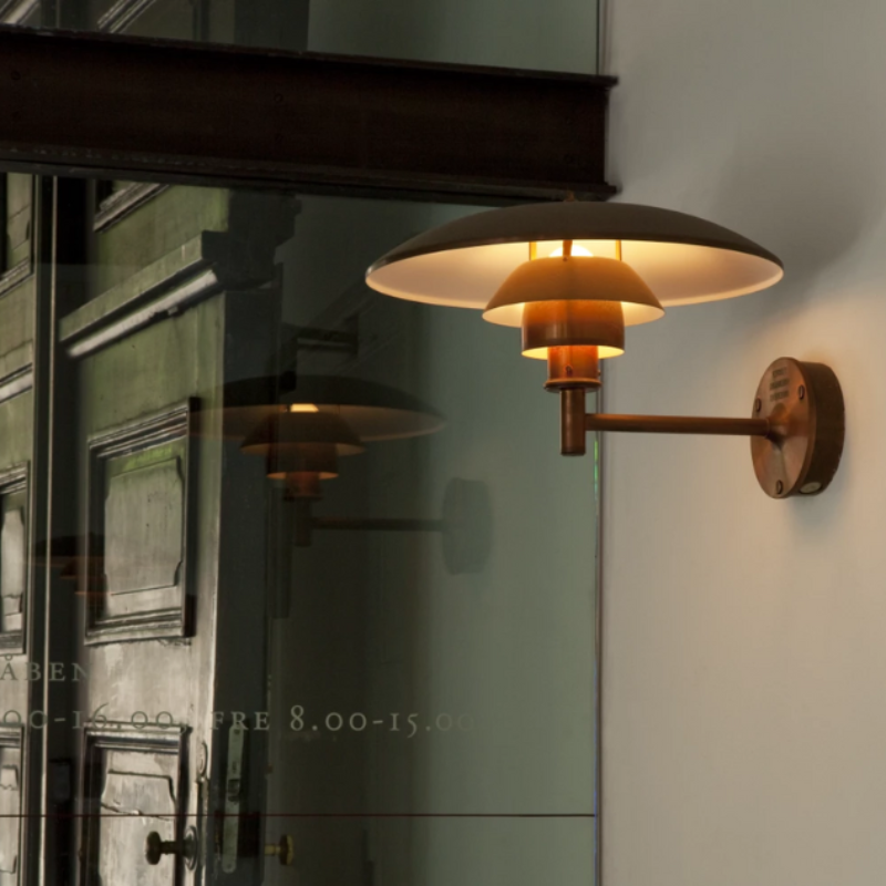 Poul Henningsen designed the three-shade system back in 1925-1926. The first lights using the system were designed by PH in cooperation with Louis Poulsen for an exhibition in Paris. This partnership continued up until his death in 1967. Throughout his life, PH sought to create glare-free light, direct light where it was most needed, and create soft shadows, using incandescent bulbs as a light source. PH Wall is a member of the three-shade family, which numbers 18 lights today, including three for outdoor use. Thus, PH did not just design a light but an entire system—around a thousand different models have been produced over the years. This wide selection consisted of table, floor, and wall lamps, as well as a number of different chandeliers, which were very popular in the 30s for lighting private homes from high ceilings. There were countless combination options. The lights were available in different colors as well as a range of sizes. The first shades were made of metal with a painted undersurface, such as white, gold, or silver—depending on whether diffuse, warm, or cold light was desired. Glass was later introduced for the three-shade system. In addition to the downward-directed light, glass lamps illuminated the room. PH was the first person to pursue a scientific approach to light and use the logarithmic spiral as a basis. By using a design based on the logarithmic spiral, he achieved an even distribution of light over the entire curve of the shade. This even light distribution, together with the diffuse reflection through the glass, made it possible to control glare and shadow. Each shade reduces the amount of light equally due to their distance from the light source. The PH light model numbers refer to the shade size. Each top shade had a corresponding set of middle and lower shades. In the ‘pure’ models, such as the 2/2, the top shade has a size of about 20 cm, with corresponding lower shades. PH Wall consists of an approximately 45 cm top shade but uses lower shades from the 3/3 model. These ‘hybrid’ models were introduced due to the desire to hang pendants at lower heights. The system was also used for wall, floor, and table lamps. PH Wall was launched in 1966.