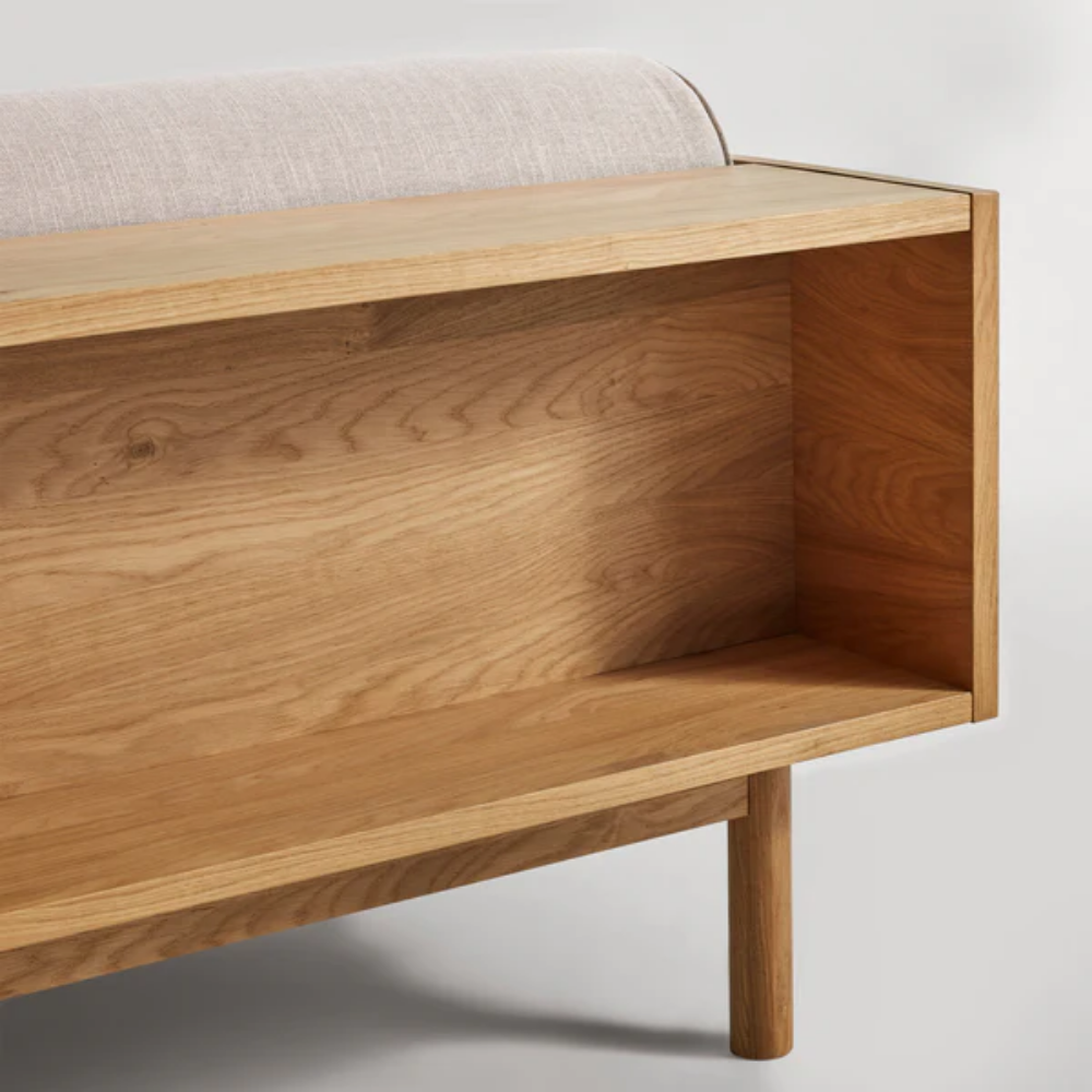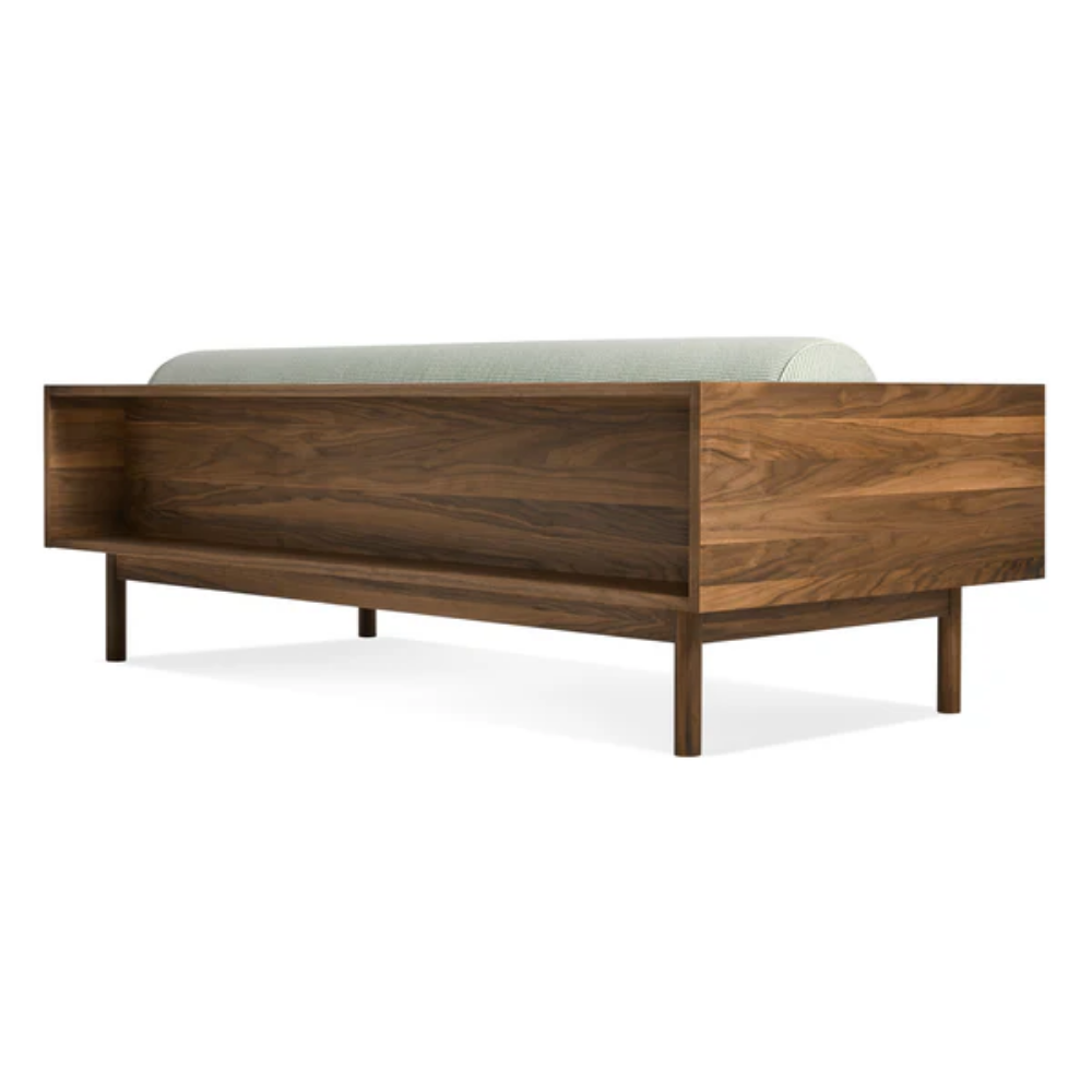 • Crafted in Canada with walnut or white oak veneers over wood, the minimal frame includes a finished shelf on the back side. Legs are of solid walnut or white oak.