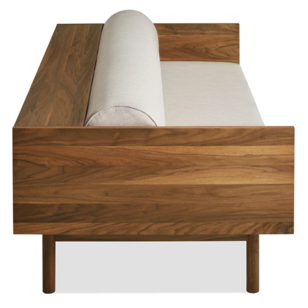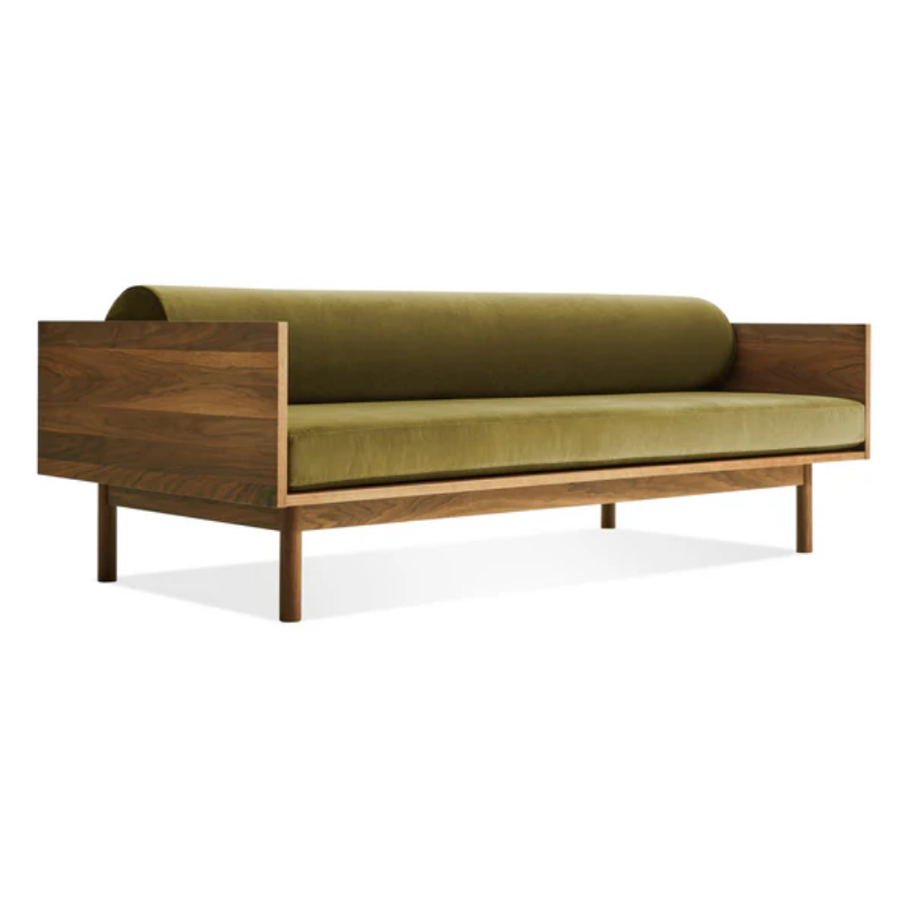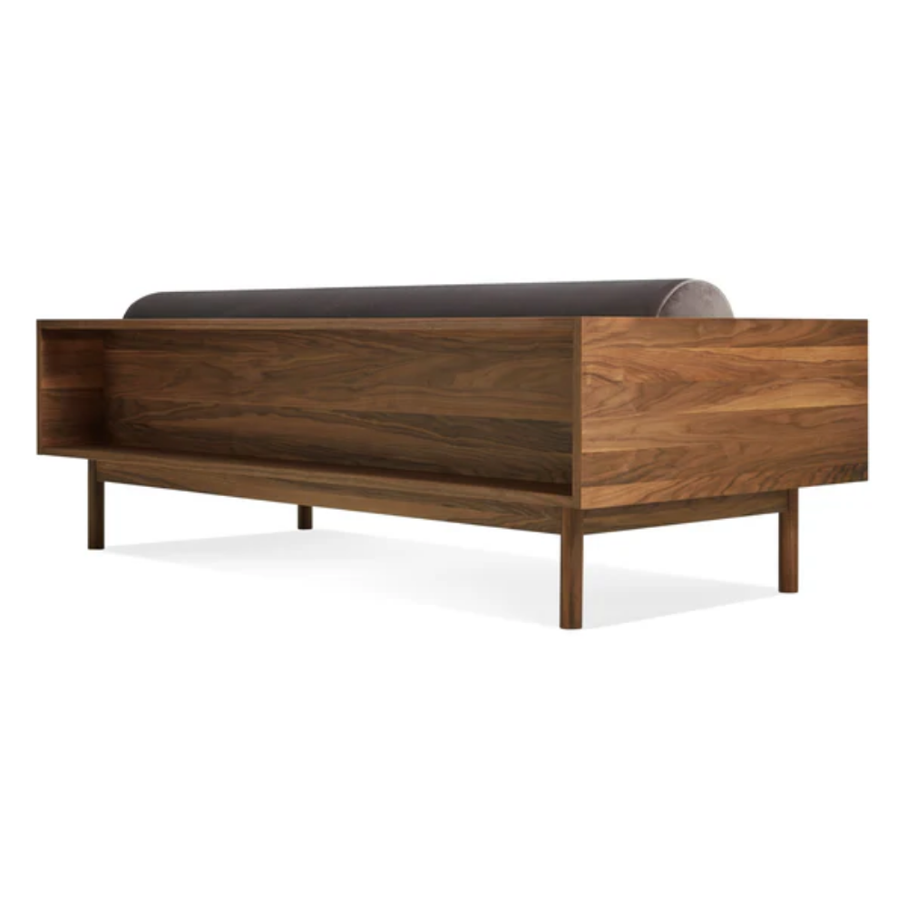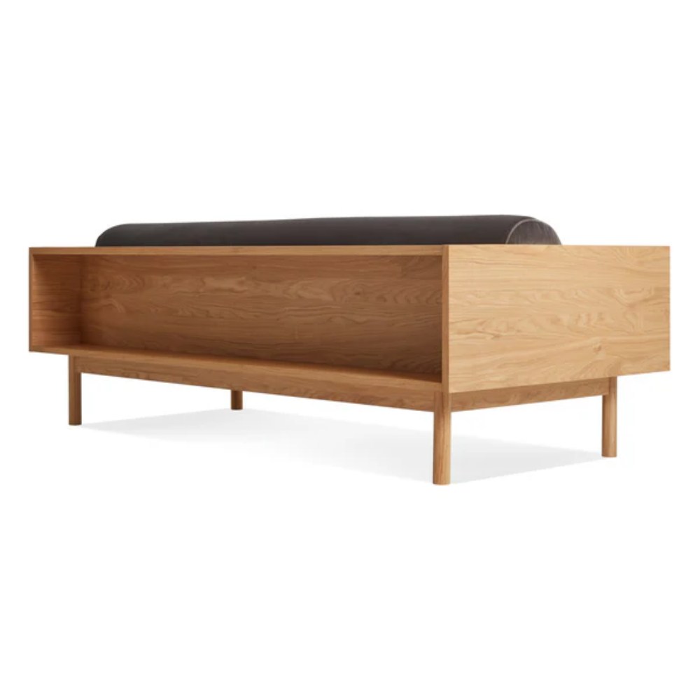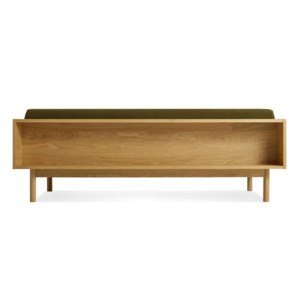 Sofa and bookshelf come together to create an artful display of form and function. Solid wood makes for a dazzling surround while serving as a chic spot to show off your ephemera or rest your martini. A genteel bolster provides ample support and a pleasing vintage vibe without the online auction.