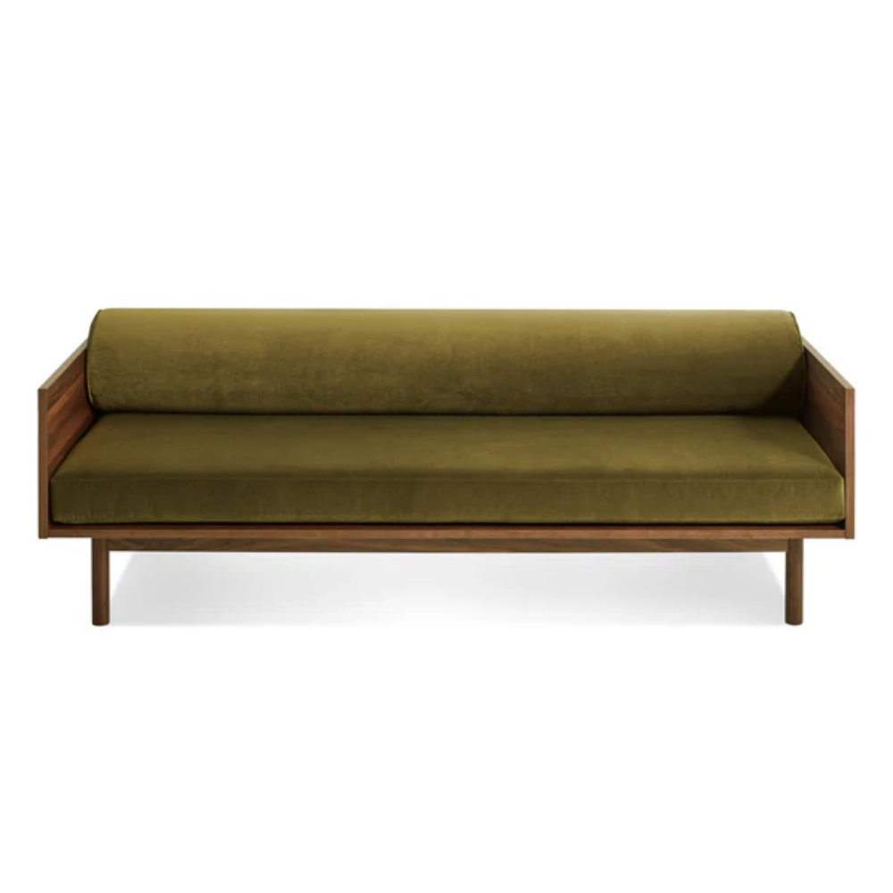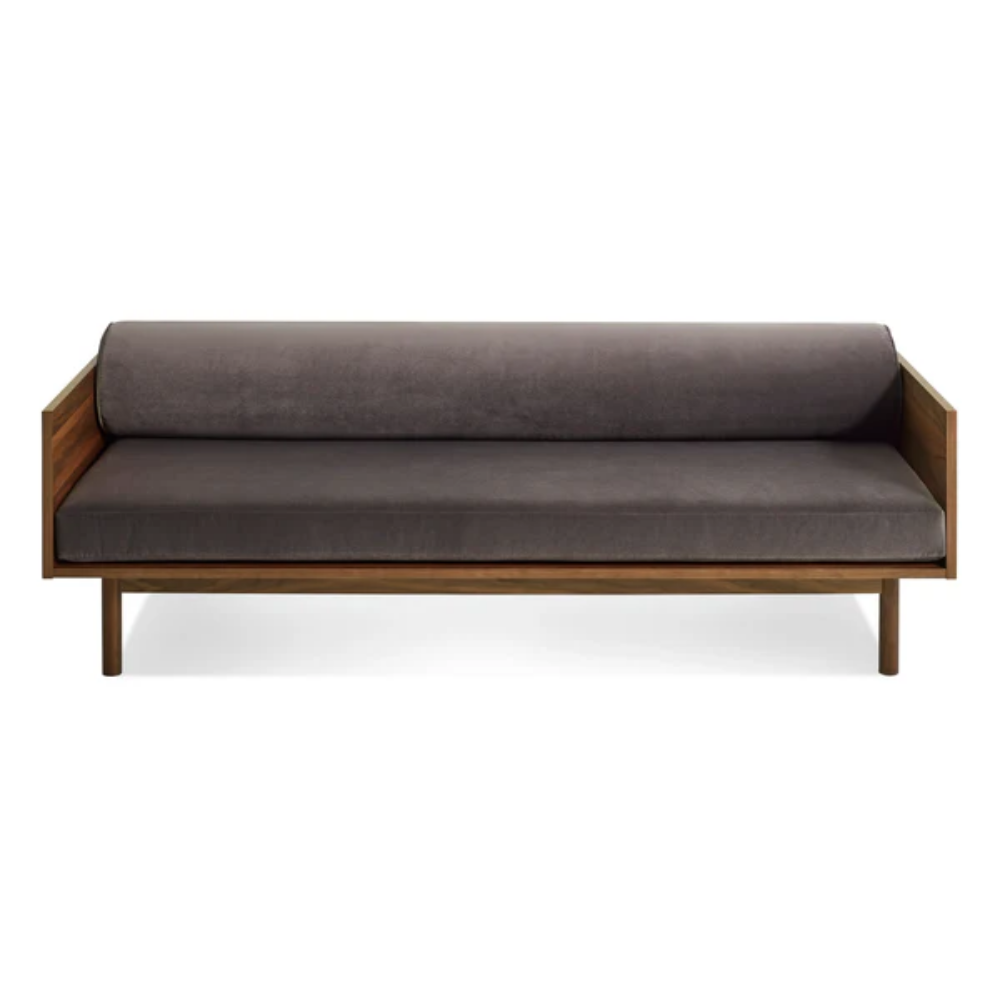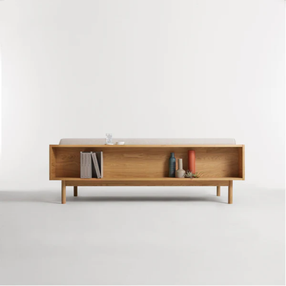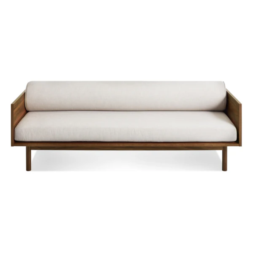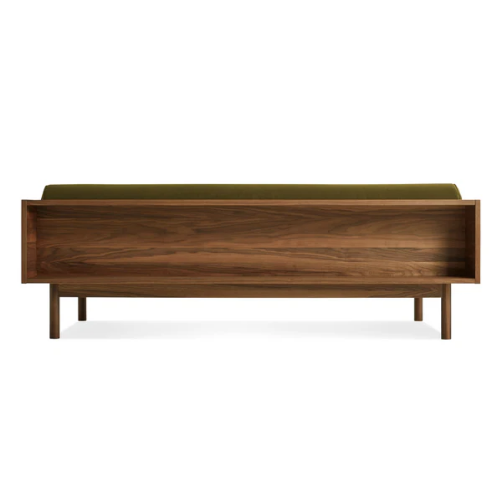 Sofa and bookshelf come together to create an artful display of form and function. Solid wood makes for a dazzling surround while serving as a chic spot to show off your ephemera or rest your martini. A genteel bolster provides ample support and a pleasing vintage vibe without the online auction.