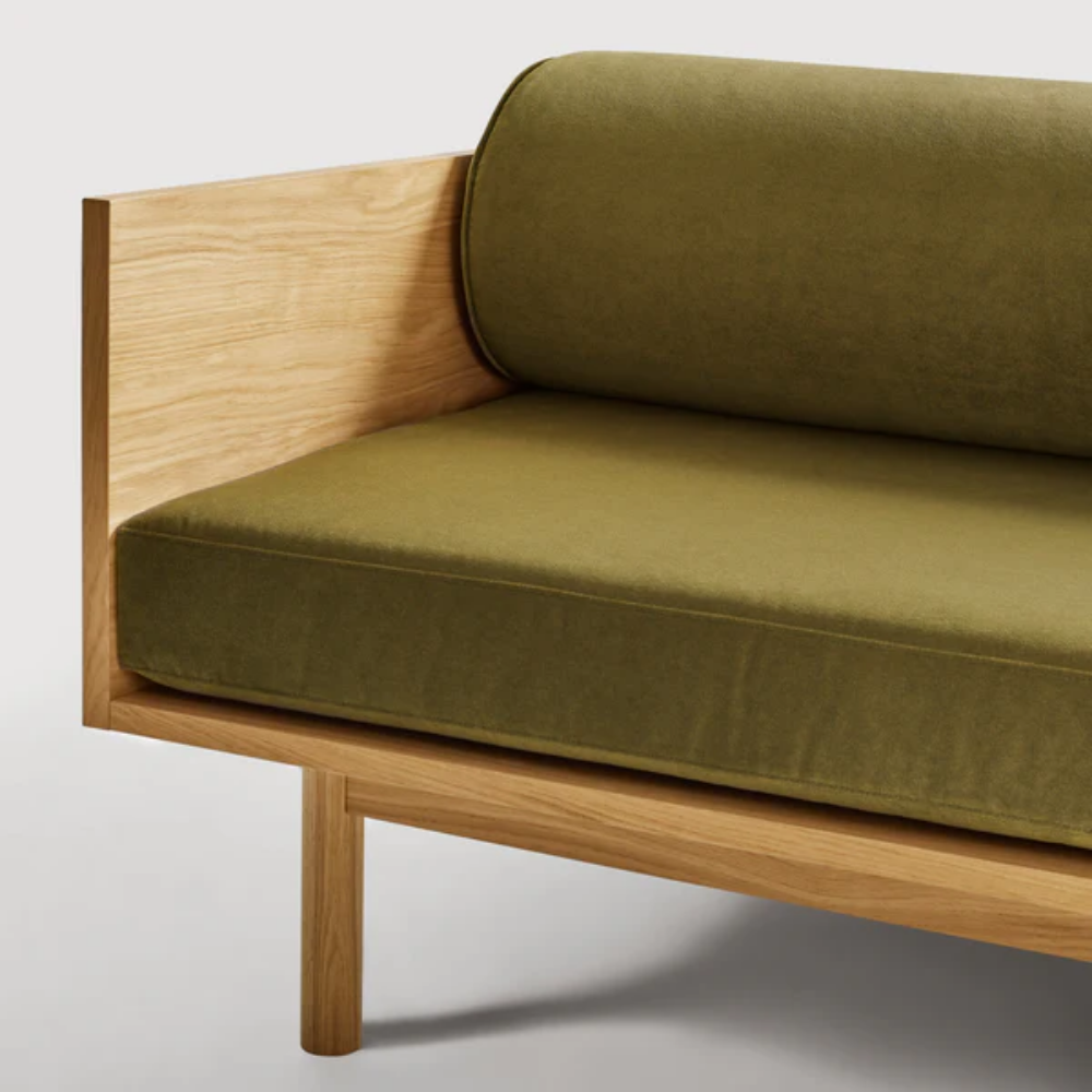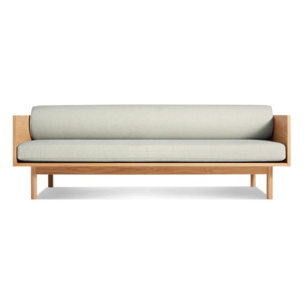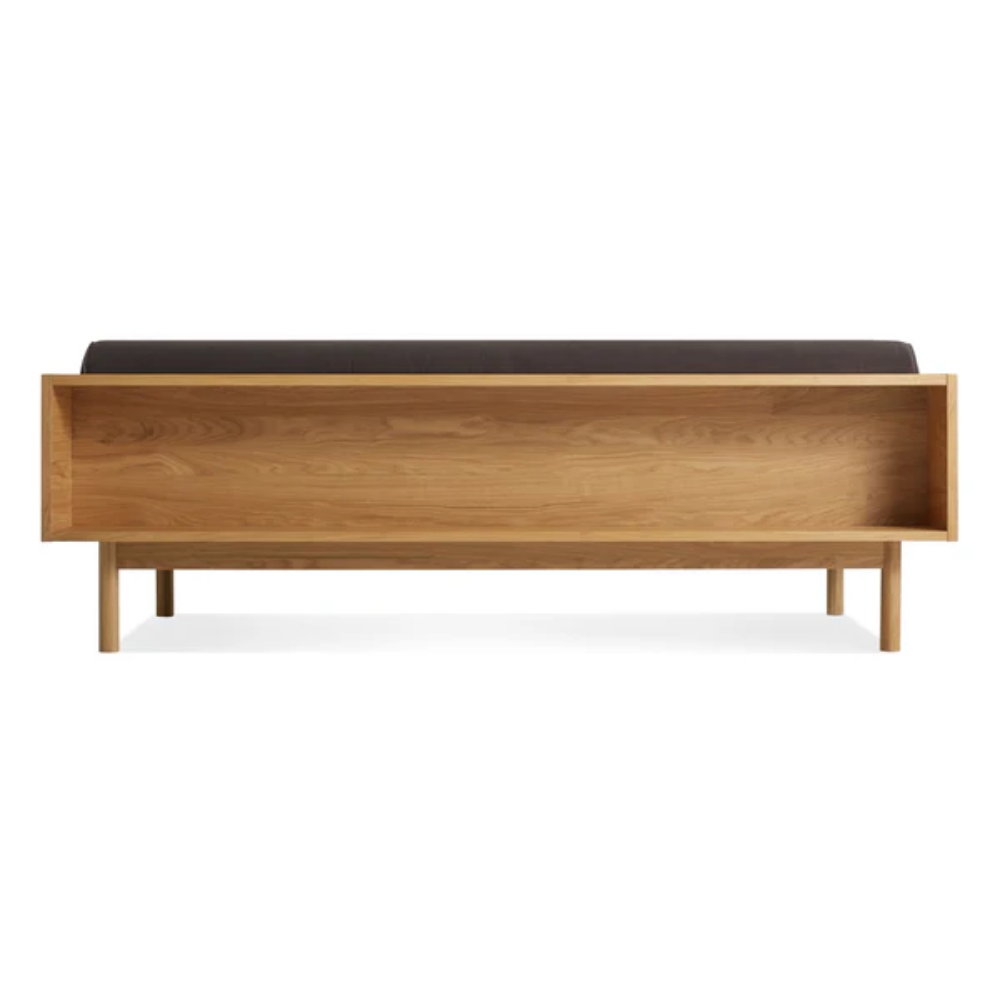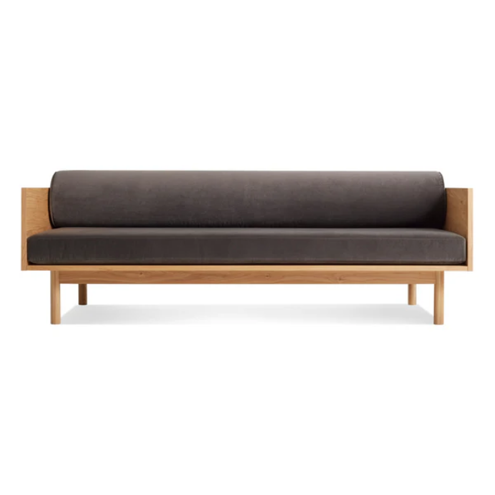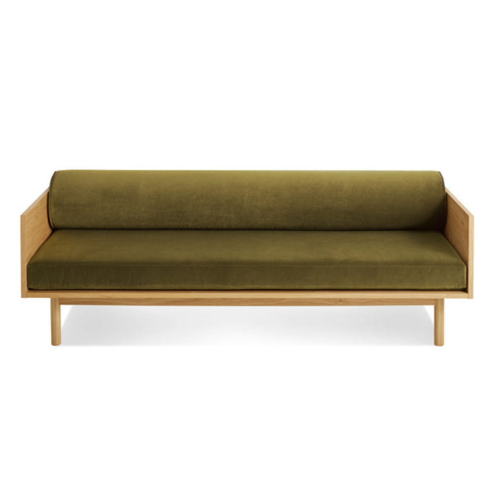 Sofa and bookshelf come together to create an artful display of form and function. Solid wood makes for a dazzling surround while serving as a chic spot to show off your ephemera or rest your martini. A genteel bolster provides ample support and a pleasing vintage vibe without the online auction.