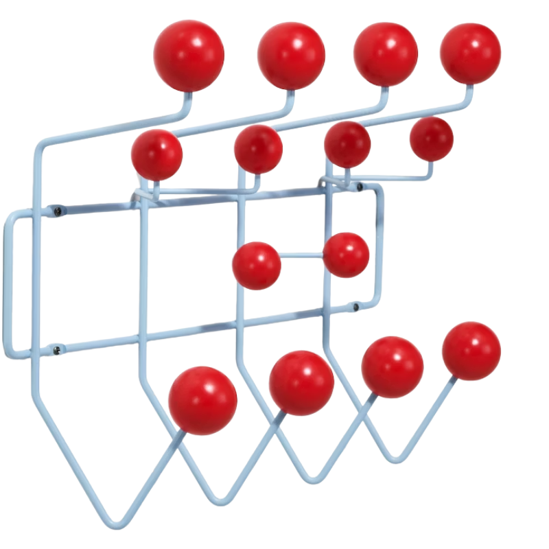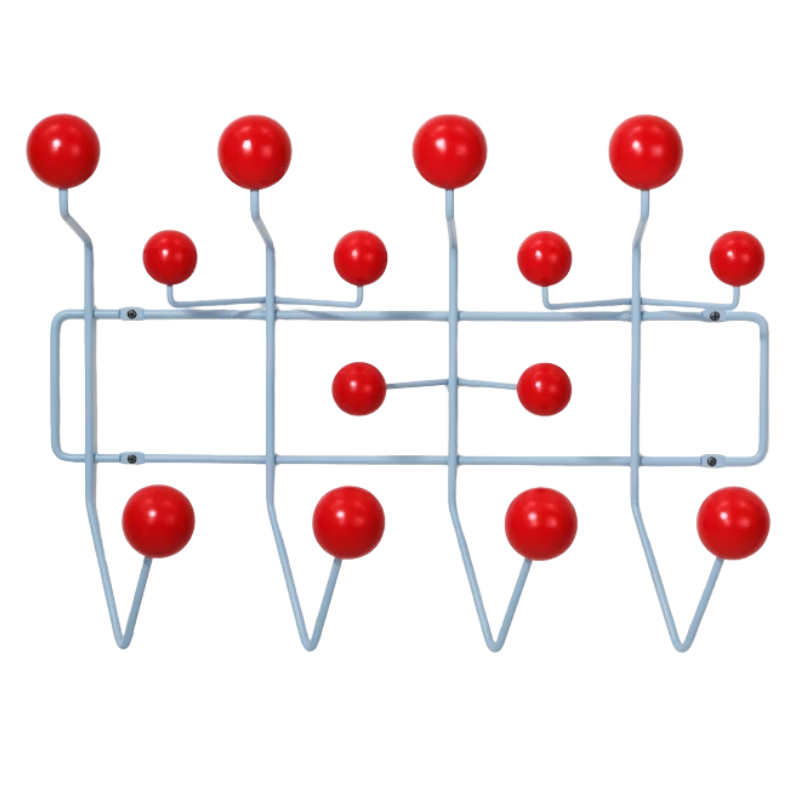 The Eames Hang-It-All, originally released in 1953, exemplifies the Eameses' belief in taking pleasure seriously. Made with a sturdy steel frame and solid wood balls, this colorful coat rack was created using the same technique for simultaneously welding wires that Charles and Ray developed for their low tables and wire chairs. Originally offered with multicolored hooks and a white frame, we've added additional neutral color options to help this fun coat rack find a home in more places.