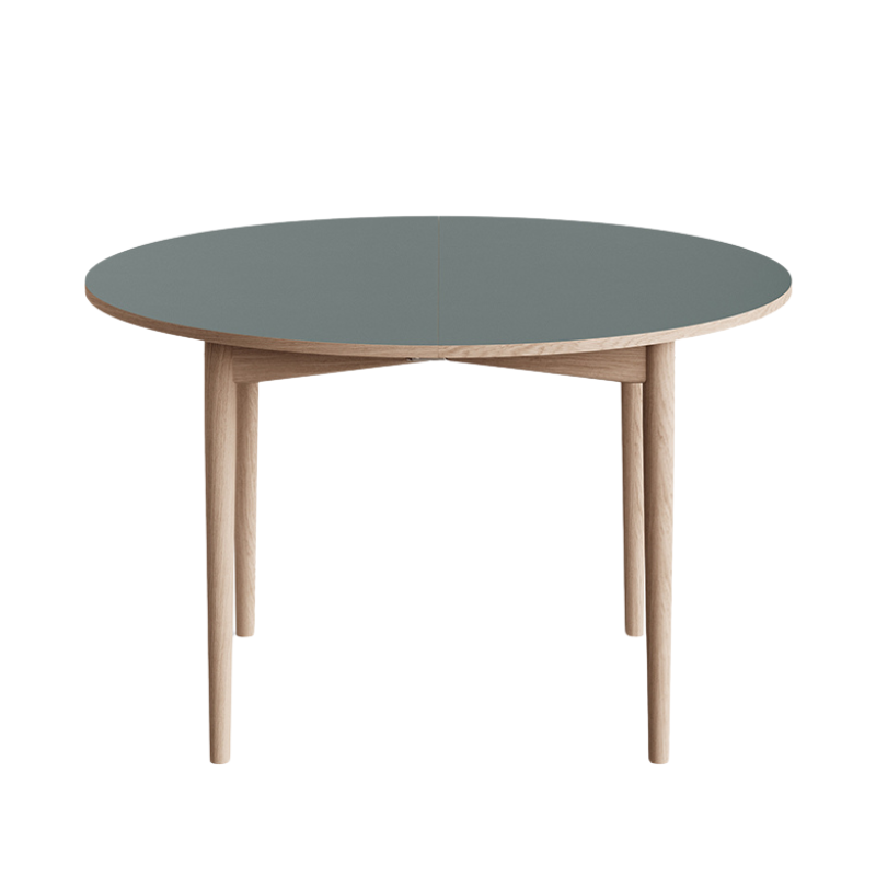 Oma is a dining table that has both a static version and an extendable version. The extendable version is designed to hold up to two leaves. There is no supporting leg needed for this solution.